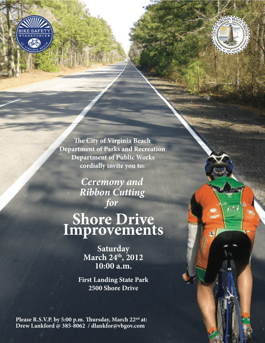Come out to the dedication to the super awesome bike lane on Shore Drive thru First Landing! Posted on March 19, 2012 by Tim RSVP to: Drew Lankford Media and Communications Department of Public Works City of Virginia Beach dlankfor@vbgov.com (O) 757.385.8062 Share this: Email a link to a friend (Opens in new window) Email Share on Facebook (Opens in new window) Facebook Share on X (Opens in new window) X More Print (Opens in new window) Print Share on Tumblr (Opens in new window) Tumblr Like Loading... Related