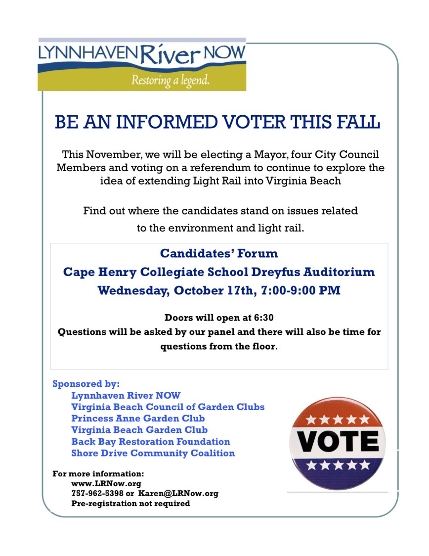 What: Virginia Beach Mayoral and City Council Candidates’ Forum. When: Wednesday, October 17th, 7-9 PM, doors open at 6:30. Where: Cape Henry Collegiate School Dreyfus Auditorium, 1320 Mill Dam Road, Virginia Beach.