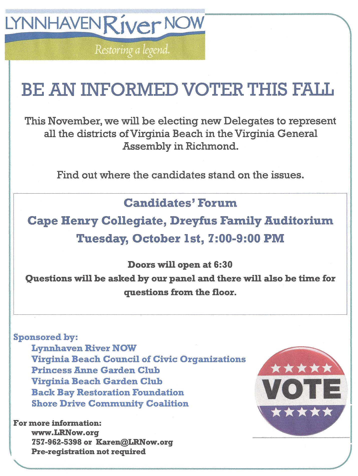 One of the easiest ways to be a good citizen is to VOTE. In order to make an educated choice, the more you can learn about each candidate the better. In an effort to provide the community with the most information possible, Lynnhaven River Now has coordinated this upcoming forum. Even though some of the districts are uncontested and you may not live in others, you can still learn about all the candidates. No matter who is elected, you can still help influence the eventual winners to make good decisions once they are elected.