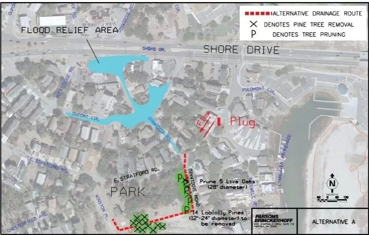A public information meeting was held on Thursday, February 23, 2012, to review three alternatives for relieving tidal flooding up to elevation 5 in the vicinity of the intersection of Dupont Circle and Dinwiddie Road. Subsequent to that meeting the Ocean Park Civic League endorsed Alternative A. Alternative A proposes a 27-inch storm drain along Dinwiddie Road from East Stratford Road to Lockhaven Crescent (paper street), then westward along Lockhaven Crescent (South edge of Lockhaven Neighborhood Park) to the Ocean Park Stormwater Pump Station on Winston Place in the vicinity of the proposed Brock Environmental Center parking lot.