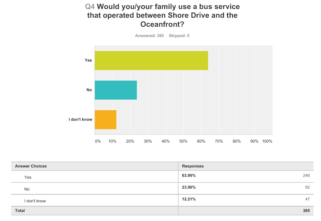 In an effort to help the City of Virginia Beach and the Bayfront Advisory Commission research the possibility of a Shore Drive – Oceanfront trolley, the SDCC ran a one month online survey. 385 survey takers provided valuable input as to why and why they wouldn’t use the service. The results are posted below and have been shared with the Bayfront Advisory Commission, the City of Virginia Beach Staff, City Councilmen Jones, Wood and Uhrin and Hampton Roads Transit. Thank you to everyone for taking the time to provide your opinions.