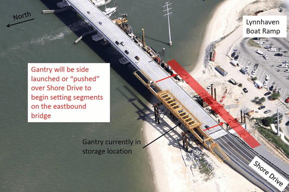 To do this, we need to temporarily close Shore Drive to slide the gantry over the roadway and into position on the south side of Shore Drive.