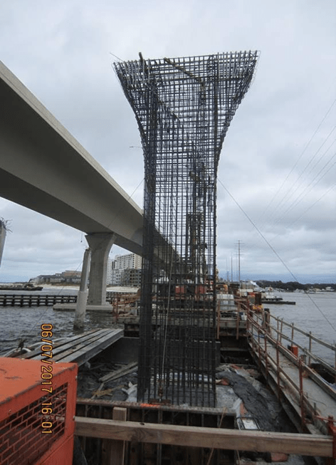 Piers 1 and 2 (of 9) of the new eastbound bridge have been completed. All of the drilled shaft foundations and the footing for Pier 3 have been completed and only one drilled shaft remains to be installed for the foundation at Pier 4.Reinforcing Steel at Pier Column 3