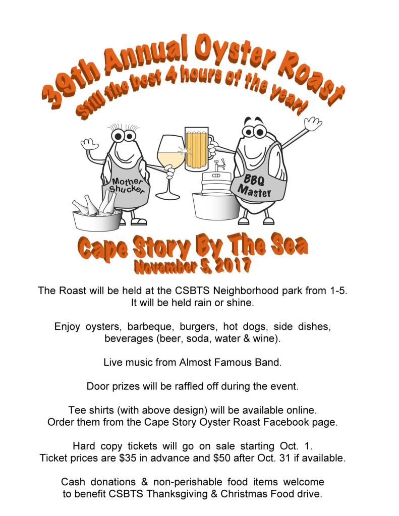 Cape Story’s 39th Annual Oyster Roast – Sunday Nov. 5th, 1-5pm Posted on October 17, 2017 by Todd Solomon Click here for more information on how to purchase tickets Share this: Click to email a link to a friend (Opens in new window) Email Click to share on Facebook (Opens in new window) Facebook Click to share on X (Opens in new window) X More Click to print (Opens in new window) Print Click to share on Tumblr (Opens in new window) Tumblr Like Loading... Related