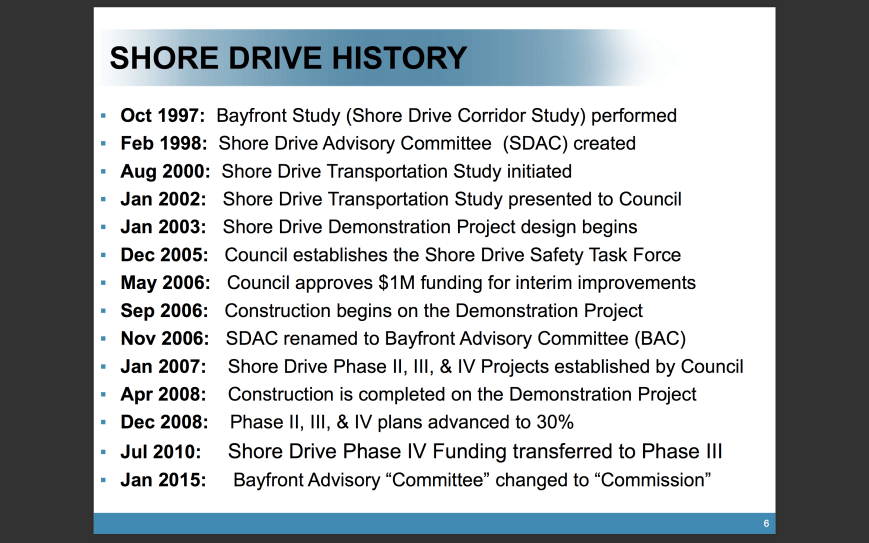 SHORE DRIVE CORRIDOR: PAST, PRESENT, & FUTURE presentation to City Council scheduled for MARCH 13, 2018 Posted on March 11, 2018 by Tim View entire 39 page slideshow. (PDF) You can watch it live at this link on Tuesday March 13th at 4pm. Share this: Click to email a link to a friend (Opens in new window) Email Click to share on Facebook (Opens in new window) Facebook Click to share on X (Opens in new window) X More Click to print (Opens in new window) Print Click to share on Tumblr (Opens in new window) Tumblr Like Loading... Related
