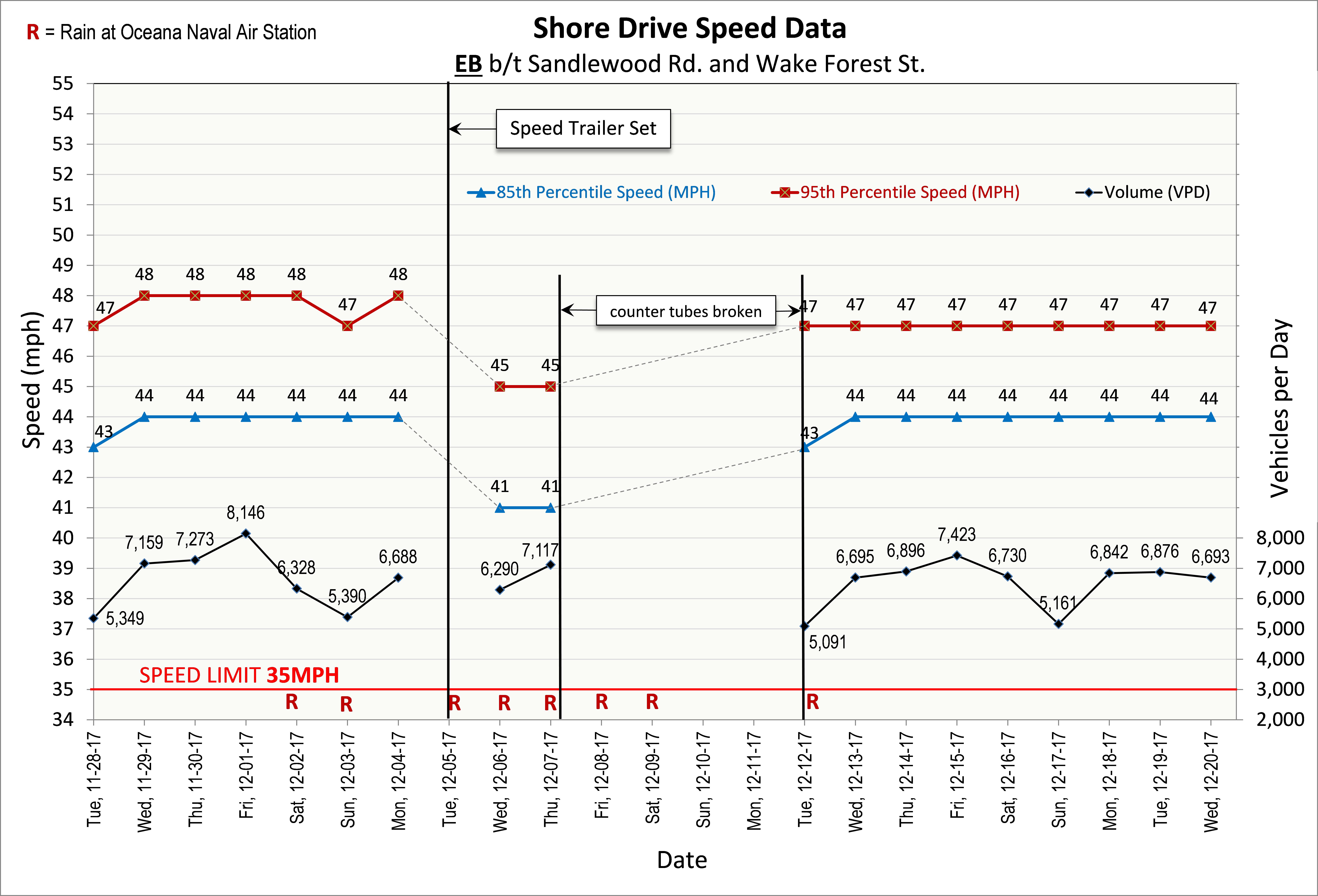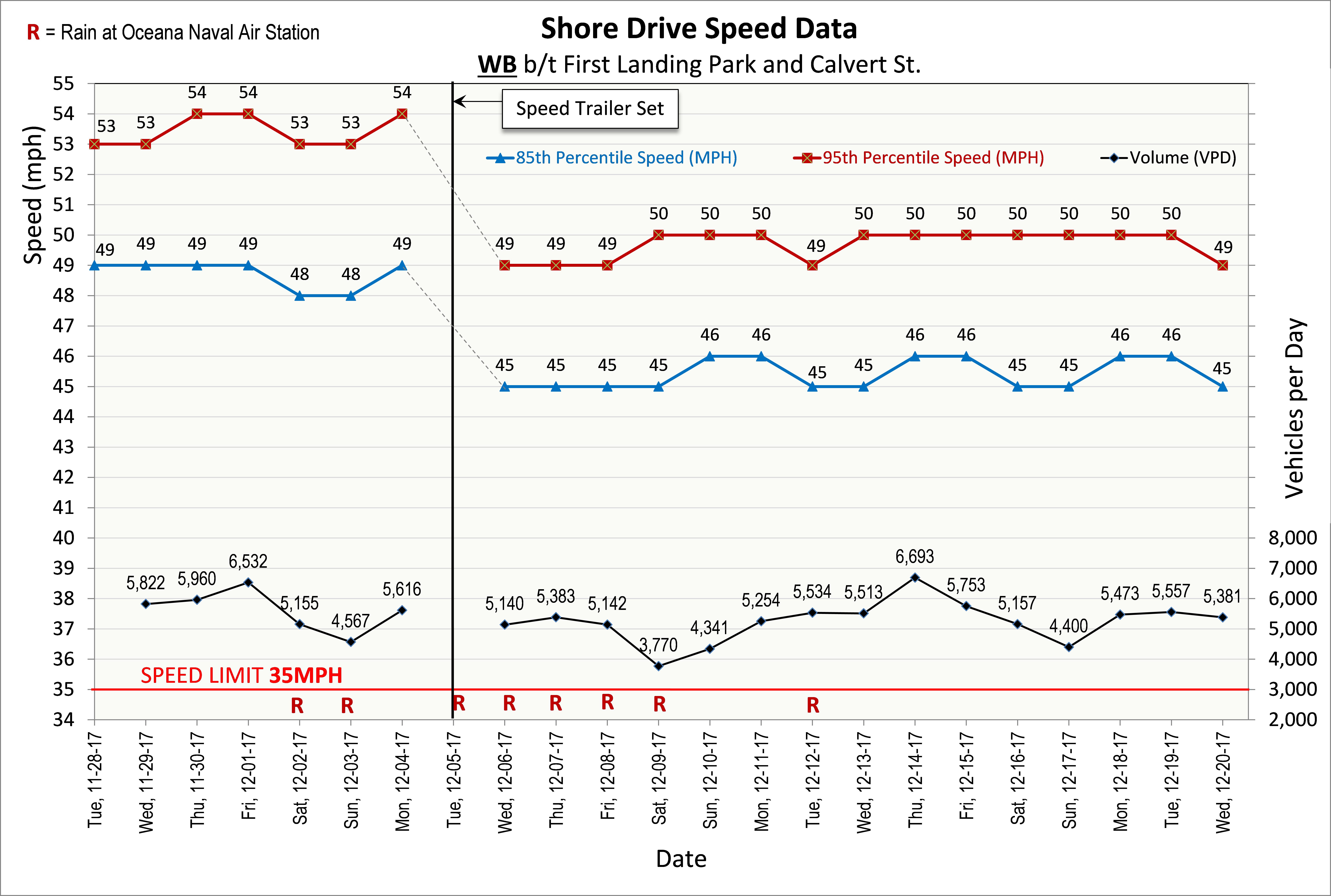 The Traffic Engineering Division of the City of Virginia Beach (CVB) has conducted a test to evaluate the effectiveness of “Real-Time Electronic Speed Feedback Displays” (RTESFDs) at improving compliance with the posted speed limit. Shore Drive in the Cape Story area was utilized as the test case area and the CVB’s existing trailer mounted RTESFDs were utilized for the evaluation. The purpose of the study was to determine if the devices are effective at improving compliance with the posted speed limit, and if so, to what degree is speed of traffic modified, and is the change sustainable. Locally, the City of Norfolk has utilized these devices, however before and after data were not collected so the performance could not be evaluated.