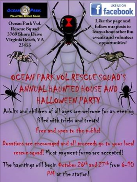 Visit our second annual night of frights at the OPVRS Haunted House. This event is free, open to the public, and family friendly. The event will be held on Friday October 26th and Saturday October 27th from 6-10pm at the station. Station address is 3769 Shore Drive. Donations are welcome.