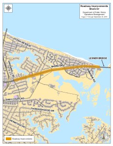 The project will include milling, paving and pavement marking improvements which will begin on Shore Drive, both eastbound and westbound lanes, from Greenwell Road to the Lesner Bridge
