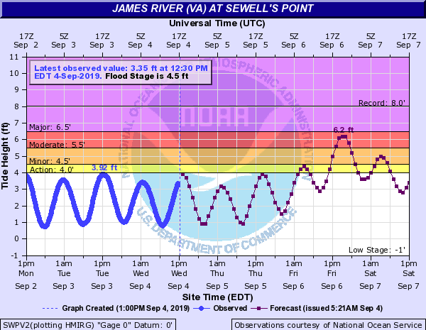 Newest word from Jeff Orrock at NWS Wakefield is that the tidal waters are likely to hit 6.5 – 7 feet. That’s somewhere between Matthew (6 feet above Mean Lowe Low water) and Irene at 7.6 feet. Plan on 7 feet and hope for less? But the rain will be an issue on all those poorly draining streets and those places where stormwater lines bring water back up into the neighborhood.