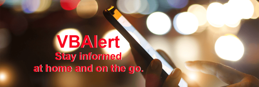 From severe weather to public safety situations, emergencies can happen at any time. VBAlert, the City’s FREE subscription-based emergency notification service, sends critical emergency messages via text, email, and phone, depending on a subscriber’s preferences.