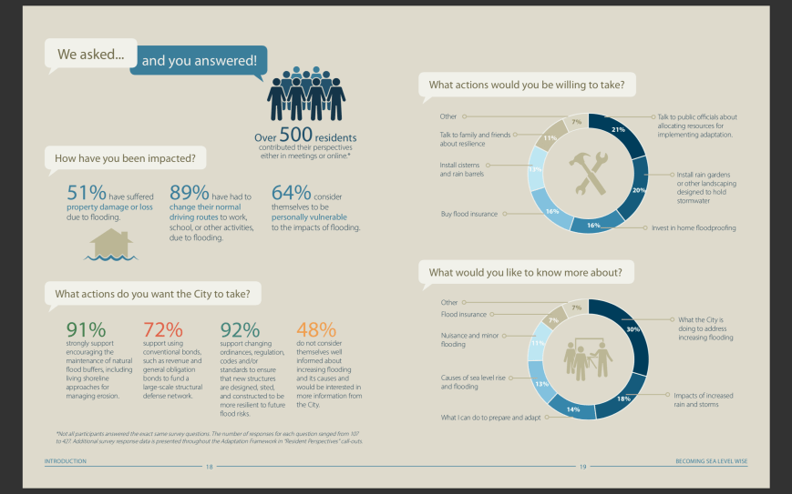 The City’s flood risks are also recognized by organizations that rate the financial strength and borrowing ability of municipalities.In 2014, the credit rating agency Moody’s Investors Service Inc. sent a questionnaire to the City. It asked about the City’s sea level rise vulnerabilities, expenses, and plans to address future impacts. Thanks to the newly created Sea Level Wise program, the City was able to speak to proactive flood mitigation efforts underway, stating: