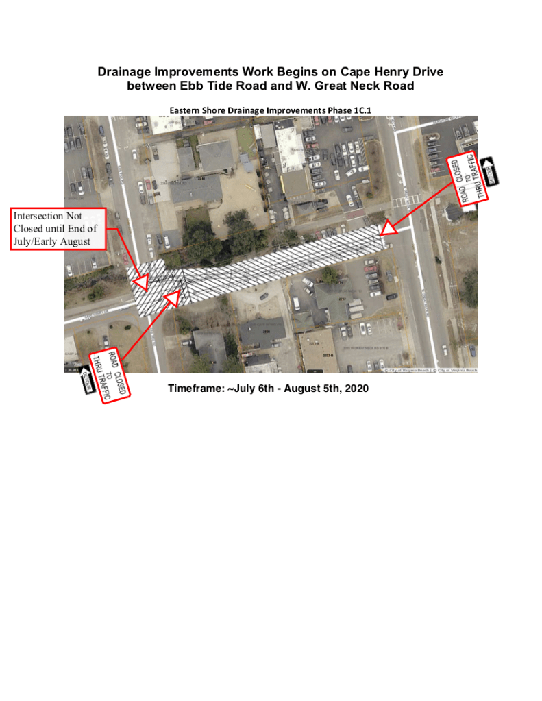 Complete closure of Cape Henry Drive between Ebb Tide Road and W. Great Neck Road. Contractor will provide access to driveways and the Citrus delivery area.July 6th, 2020 – August 5th, 2020.