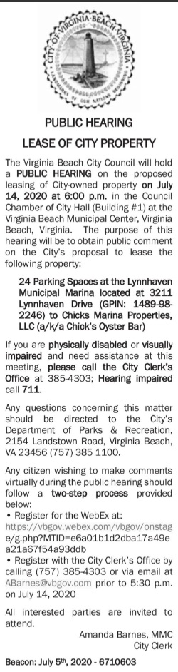 As a current Slipholder at Lynnhaven Municipal Marina, I wanted to make you aware of a consideration to potentially lease Chick’s Oyster Bar 24 car parking spaces at the north end of the Marina. After we recently completed the replacement of the collapsed bulkhead area behind the west mooring area at the Marina, Chick’s formally requested to lease parking spaces for their employees on an annual basis. If approved, the City would be paid a monthly fee per space for the 24 parking spaces as part of the lease. Additionally, the use and lease would be subject to terms and conditions, and would be renewed on an annual basis for a period not to exceed five total years, should all terms and conditions continue to be met.