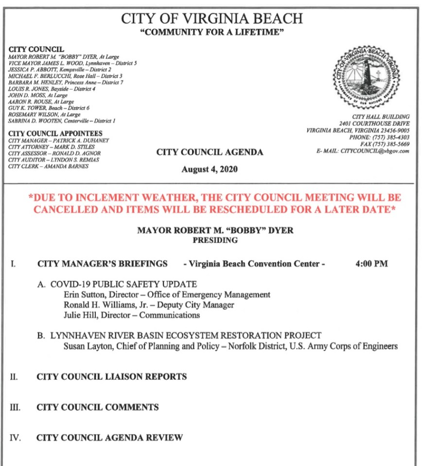 - The Aug. 4 City Council meeting – items that were to be considered will be rescheduled for Council meetings on Aug. 18 or 25.