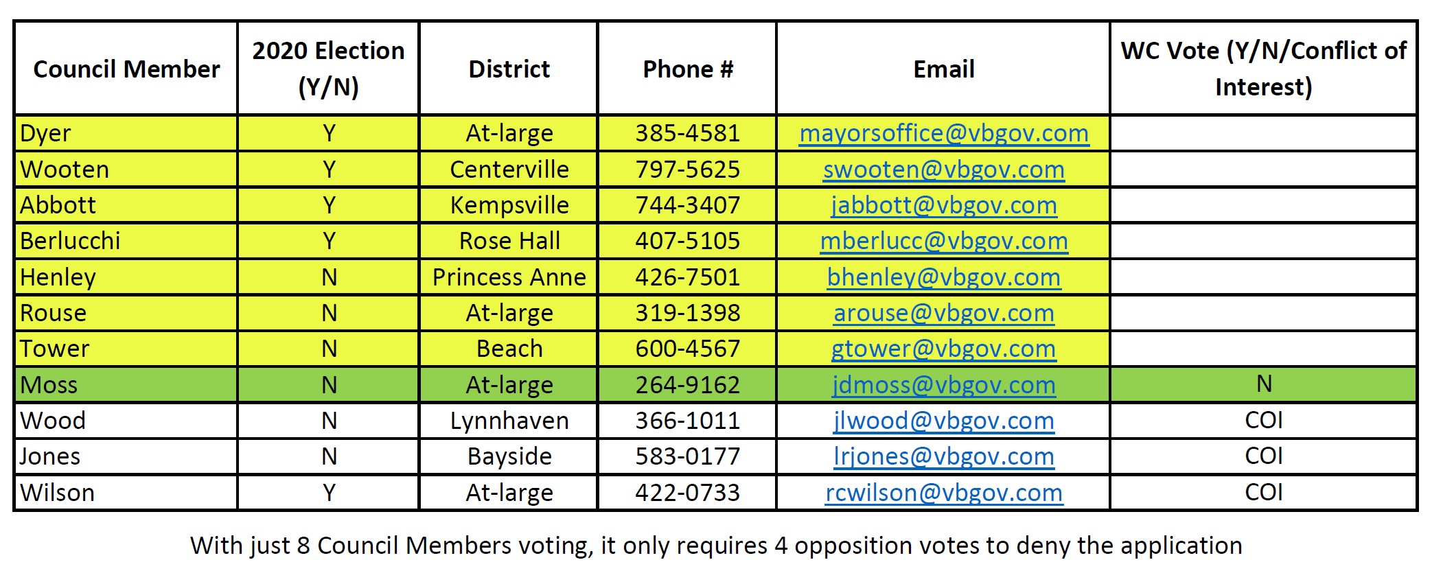 Suffice to say, it can all come down to the votes of 7 Council Members. With 3 of the 11 members recusing themselves due to Conflict of Interests, the remaining 8 would require a 5 to 3 vote in favor to approve the application. A 4 to 4 tie vote fails. So the goal to stop this proposed plan is to get 4 “NO” votes from the remaining 8 members. One member, Mr. John Moss, has gone on public record as voting “NO”, so that leaves 7 members and the need to gain 3 “NO” votes.