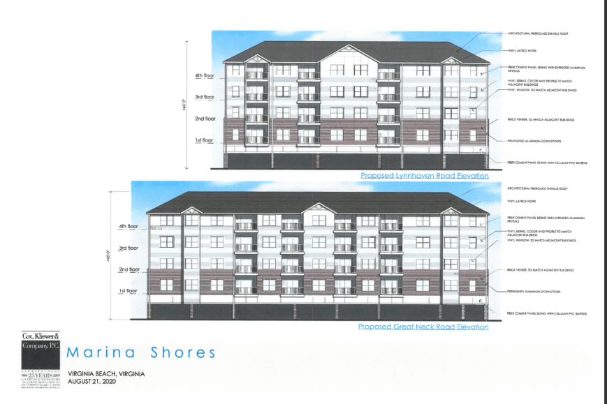 It will be a 65 foot, 5 story building with 4 floors of apartments over top covered parking. This building will be one story taller than all the existing buildings which have 3 floors of living space over 1 of covered parking. It also looks like this new building will be about 25 feet closer to North Great Neck Road than the closest existing building.