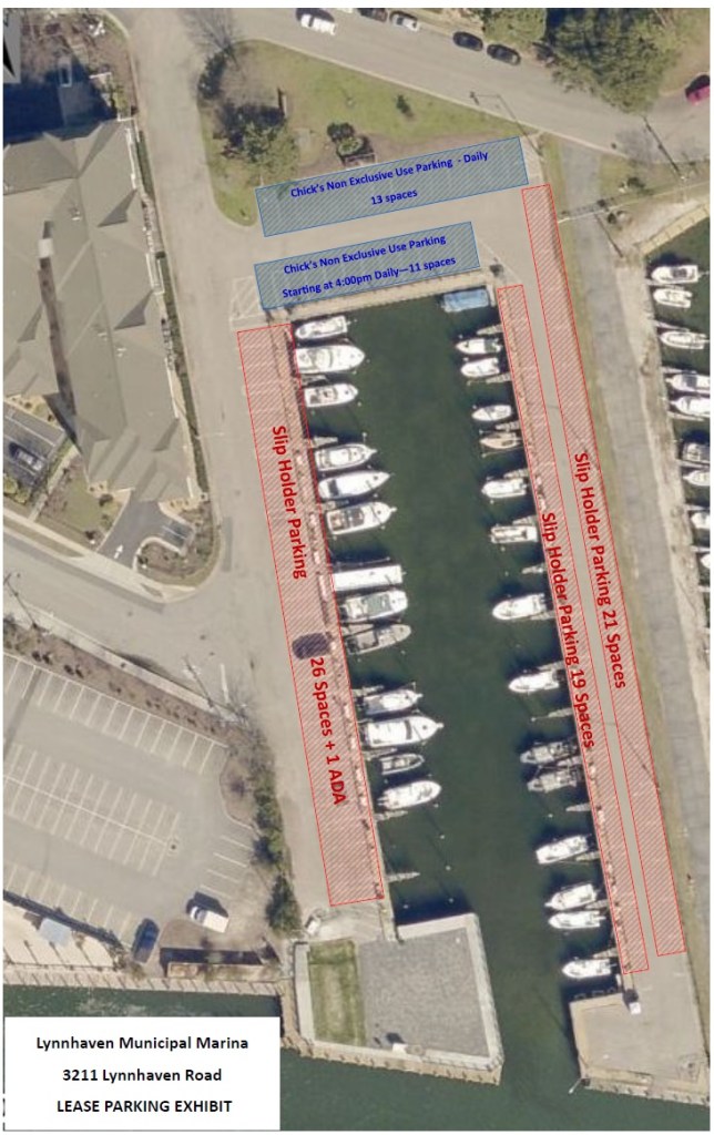 As a current Slipholder at Lynnhaven Municipal Marina, I wanted to make you aware of a consideration to potentially lease Chick’s Oyster Bar 24 car parking spaces at the north end of the Marina. After we recently completed the replacement of the collapsed bulkhead area behind the west mooring area at the Marina, Chick’s formally requested to lease parking spaces for their employees on an annual basis. If approved, the City would be paid a monthly fee per space for the 24 parking spaces as part of the lease. Additionally, the use and lease would be subject to terms and conditions, and would be renewed on an annual basis for a period not to exceed five total years, should all terms and conditions continue to be met.