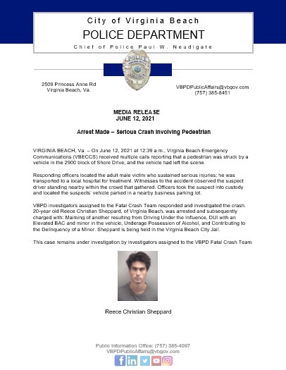 According to police, witnesses saw the driver accused of hitting the man, 20-year-old Reece Christian Sheppard from Virginia Beach, standing close by in the crowd surrounding the crash.