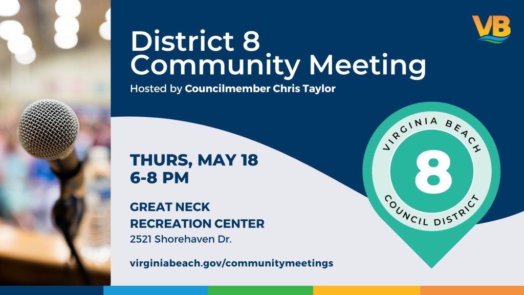 ***New Start Time***District 8 Community Meeting – Thursday May 18 @ 6:00pm Great Neck Rec Center Posted on May 17, 2023 by Todd Solomon Please note the new start time for the District 8 Community Meeting. The meeting will start at 6:00pm on Thursday May 18th. Share this: Click to email a link to a friend (Opens in new window) Email Click to share on Facebook (Opens in new window) Facebook Click to share on X (Opens in new window) X More Click to print (Opens in new window) Print Click to share on Tumblr (Opens in new window) Tumblr Like Loading... Related