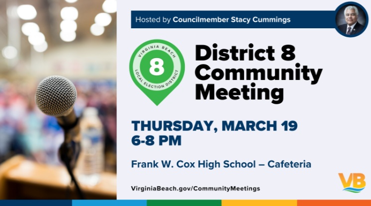 Councilmember Cummings will host a District 8 community meeting on March 19 to update residents on current City projects and issues. Topics of discussion include e-bikes, the City budget, construction on Shore Drive and the draft 2040 Comprehensive Plan. Residents also will hear from the Virginia Beach Police Department about public safety within the district. There will be an opportunity for Q&A.