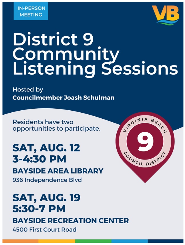 District 9 Councilmember Joash Schulman will host listening sessions—Aug. 12 from 3-4:30 p.m. and Aug. 19 from 5:30-7 p.m.—to gain input and concerns from residents prior to the City Council Retreat.
