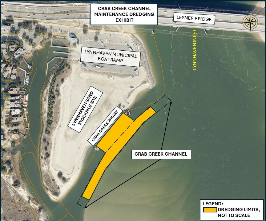 Maintenance dredging of the Crab Creek Channel, which started February 17th, will help recreational boaters progress from the boat ramp to the Bay. It will also provide improved access to the wharf for vessels used in City waterway and Neighborhood Dredging projects. All spoils material will be deposited on the adjacent stockpile for future emergency beach replenishment of Bay beaches.