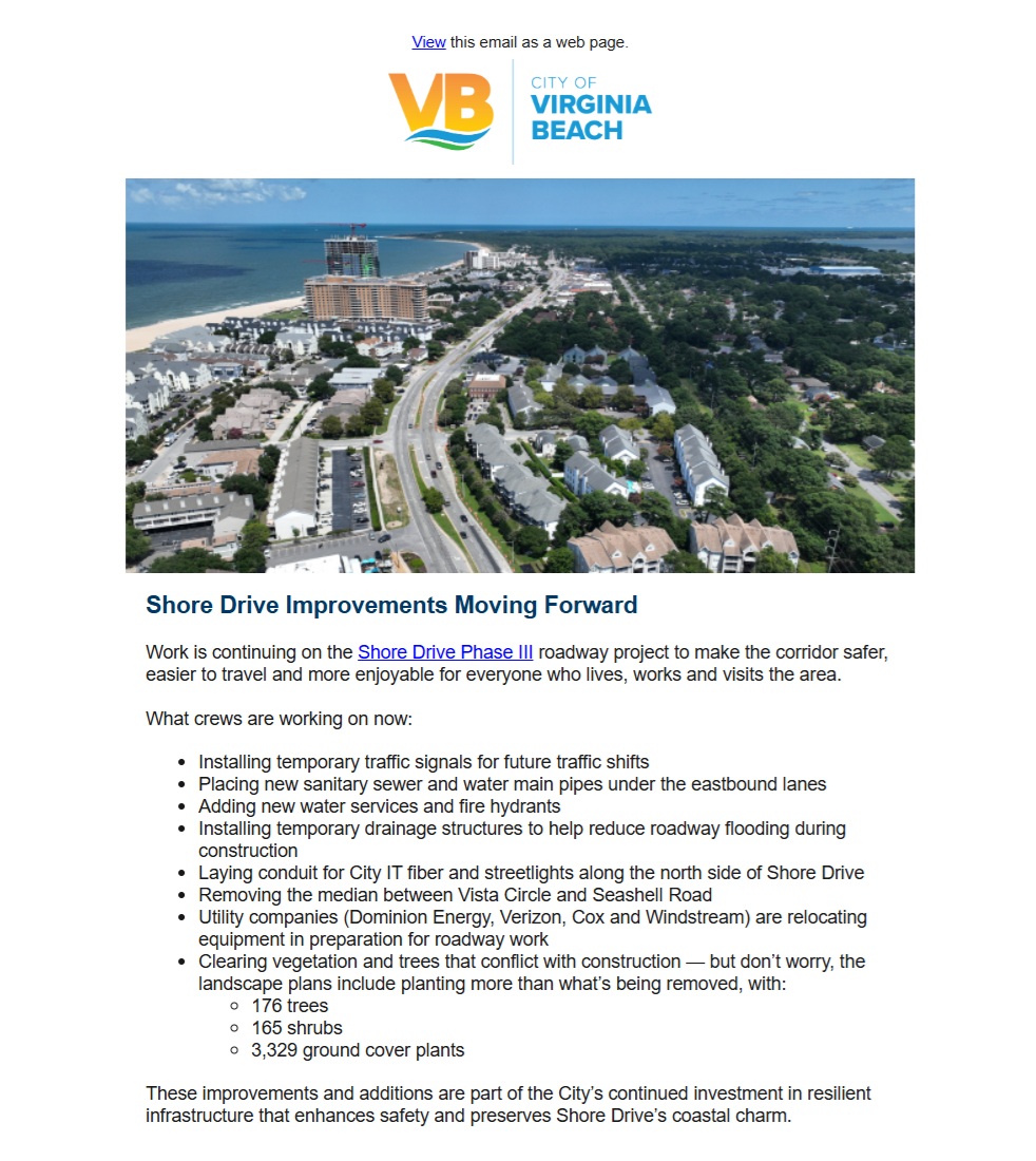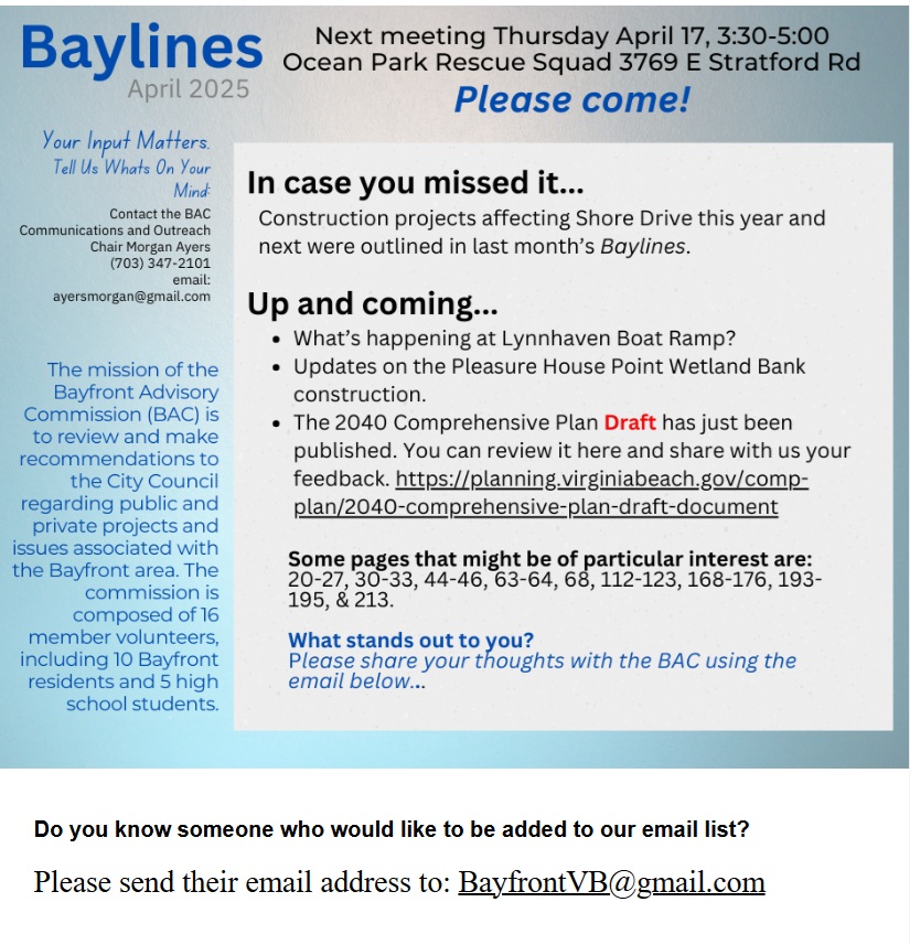 If you would like to sign up to receive the BAC’s Baylines newsletter and/or the Shore Drive Phase 3 email updates, you can find both at the City’s BAC homepage. Click the above image or the link listed below.