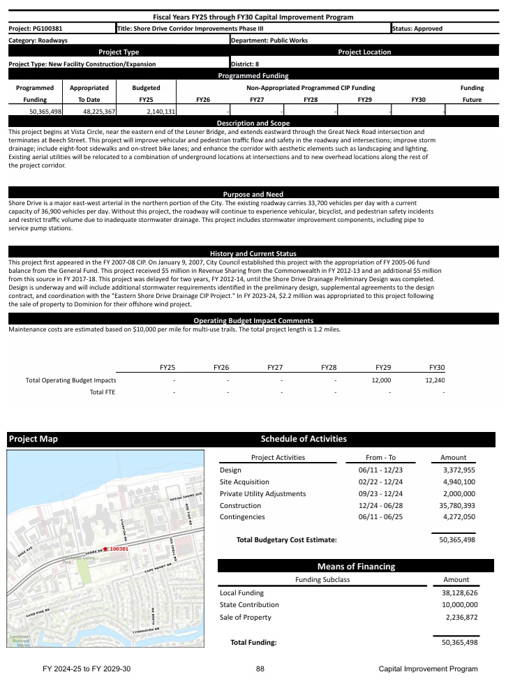 The Shore Drive Phase 3 Improvement Project(SDP3), first identified as a City Capital Improvement Project (CIP) in 2007, is finally getting ready to happen. This 3 year long construction project will improve the section of Shore Drive between the Lesner Bridge and North Great Neck Road, making the road safer for pedestrians and vehicles. Construction will take place over the next 3 years and will definitely have an impact on our Bayfront area in the process.