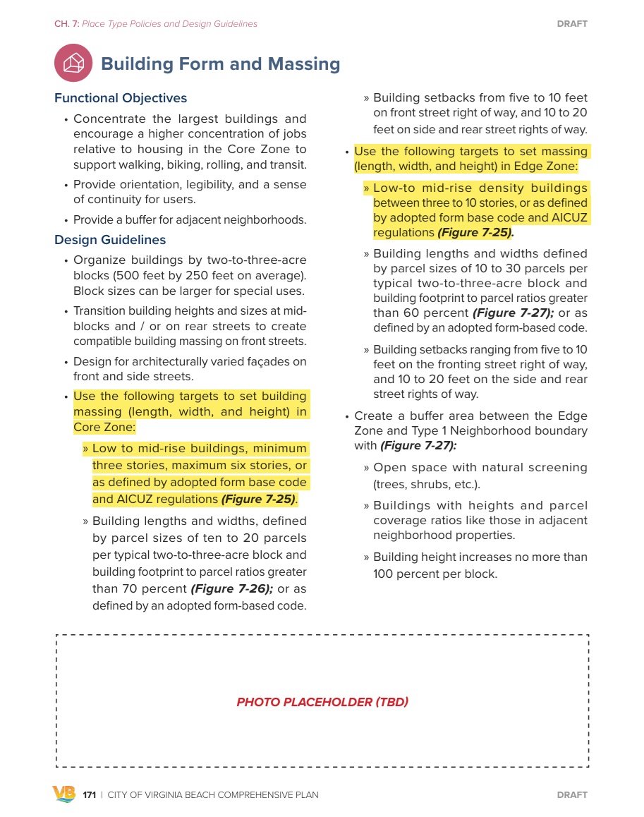 Image #3 shows the design guidelines for the Core and Edge zones for the Local Center. Core building heights of 3 to 6 stories and Edge building heights of 3 to 10 stories are recommended.
