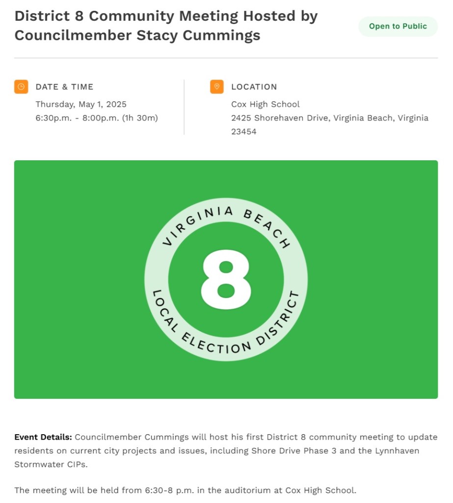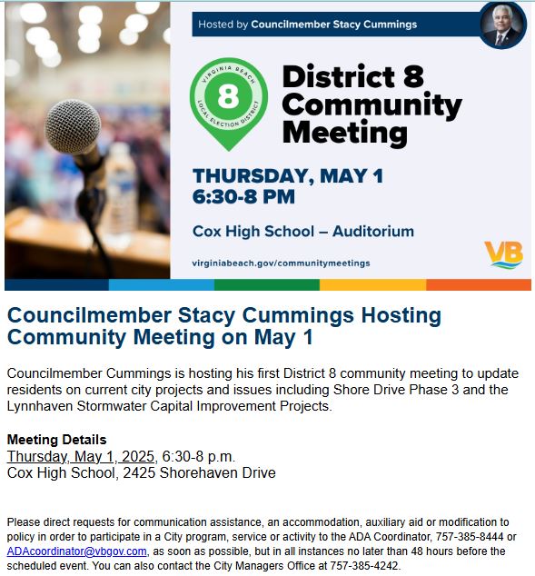 Please direct requests for an accommodation, auxiliary aid or modification to policy in order to participate in a City program, service or activity to the Communications Office, 757-385-4679, as soon as possible before the program, service or activity is scheduled to begin, but in all instances no later than 48 hours before the scheduled event.