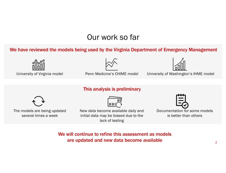 “Current social distancing efforts starting March 15 have paused the growth of the epidemic in the Commonwealth of Virginia. In this scenario, “paused” growth means that the rate of new cases is holding steady rather than increasing.”