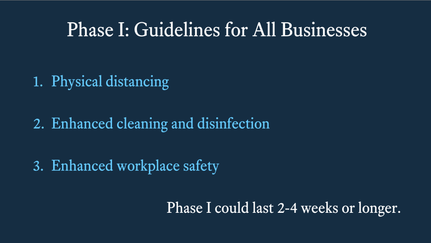 The Commonwealth is developing two sets of guidance: one with broad based recommendations for all businesses, and another with industry specific recommendations for public-facing businesses like restaurants and non-essential retail. The guidance will be provided to businesses in early May.