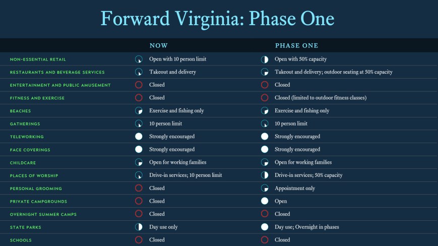 Phase One guidelines for specific sectors are available here or at virginia.gov/coronavirus/forwardvirginia.