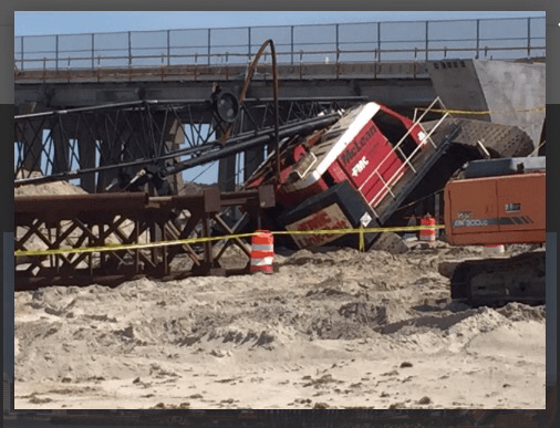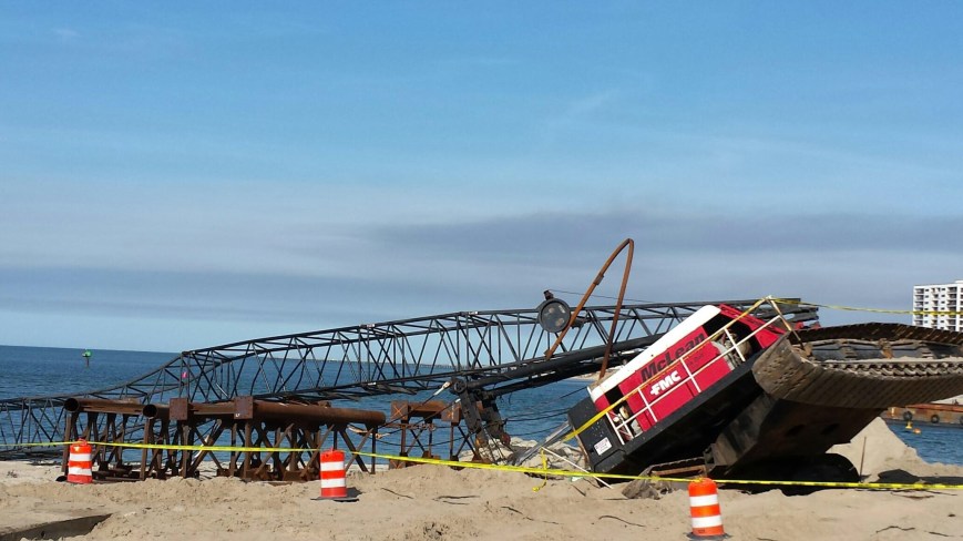 Earlier this afternoon one of the cranes being used to build the new Lesner Bridge rolled on its side as the crane operator was moving a piece of material. We are thankful that no one was hurt during this incident. Virginia Beach Police, Fire & Rescue immediately responded to assess the situation and have since left the site. The crane is located on the beach near 3556 Shore Drive and rolled toward Chesapeake Bay. Only the boom of the crane is in the bay. There have been no reported spills or discharges of hazardous materials from this incident.