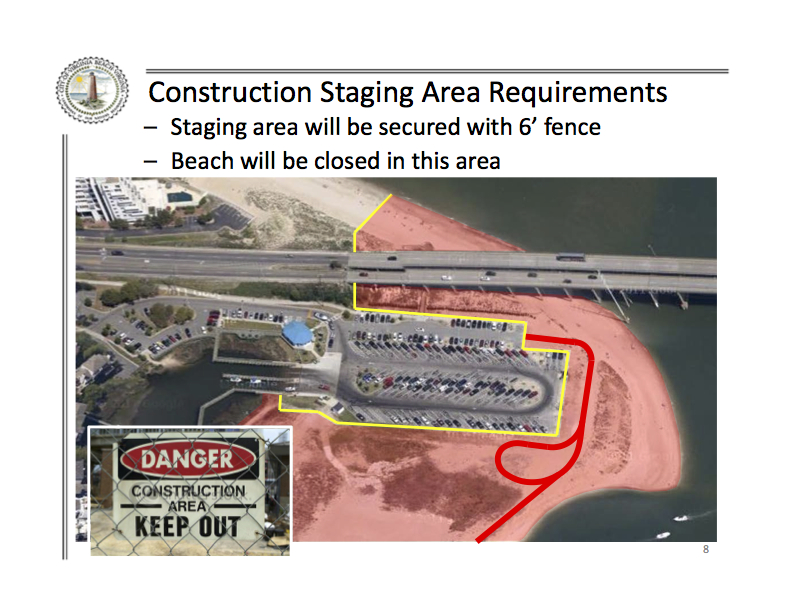 Q: “Why did the bridge contractor placed a fence at East Stratford Street and Shore Drive? This impedes pedestrians who want to cross Shore Drive from East Stratford Street to get to the beach since the beach access at the boat ramps has been closed.”