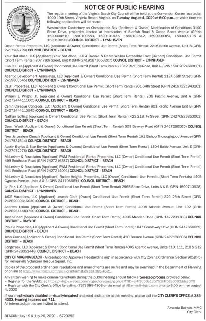 3 Council Members have recused themselves from discussing, commenting and voting on this application due to conflict of interests. Those members are Jim Wood – Lynnhaven District; Louis Jones – Bayside District and Rosemary Wilson – At-large.