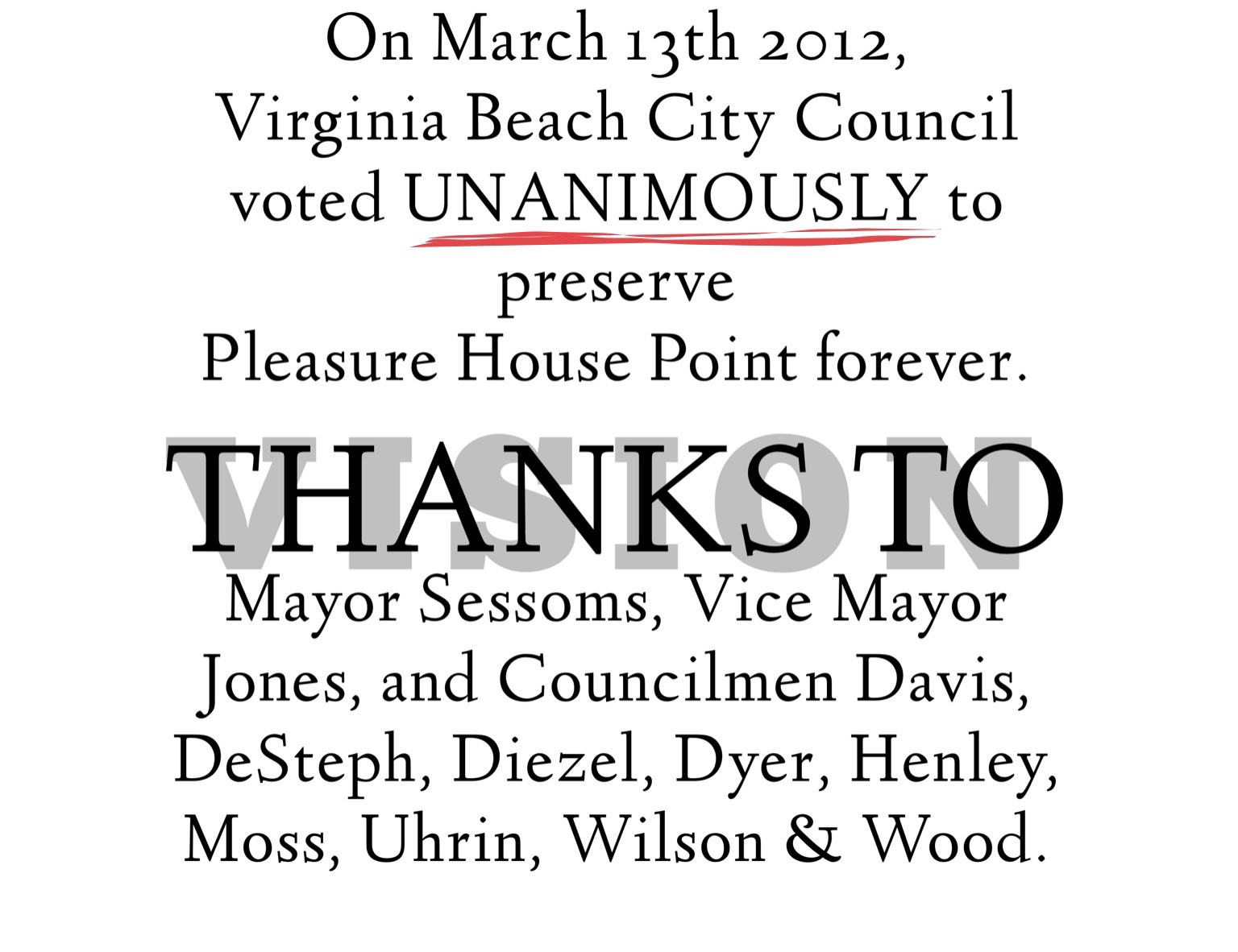 We hope Mr. Branch also has the vision Mr. Wood did in voting on March 13 2012 to permanently preserve most of Pleasure House Point.