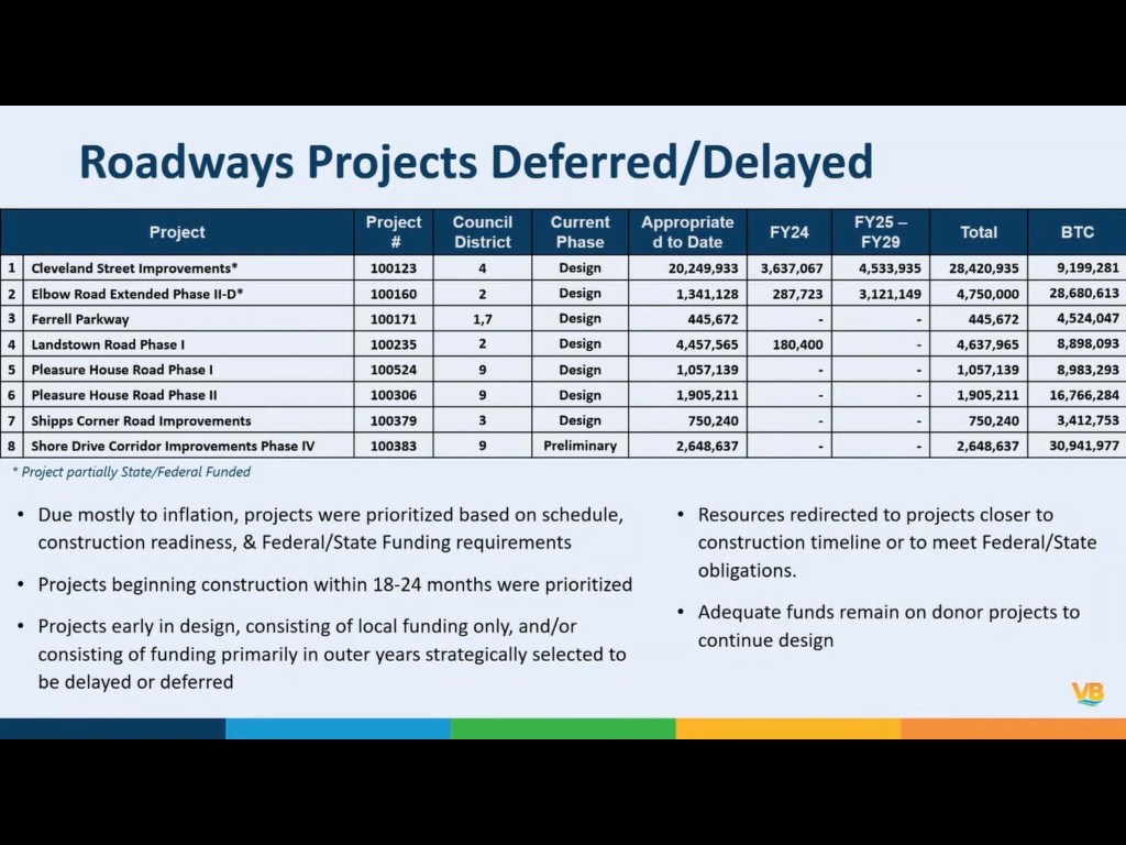 As you may recall, due to inflation, supply and labor challenges, stormwater requirements, and other factors, the estimated cost to complete the projects in our Capital Improvement Program grew by nearly $180MM as the Council considered the 2023-2024 Budget. Consequently, the Council made the difficult decision to delay/defer several roadway projects, including Shore Drive Phase IV (Marlin Bay Drive to the Lesner Bridge) and Pleasure House Road Phase II (Shore Drive to Lookout Road). Money that was originally budgeted for these projects was redirected to other projects (like Shore Drive Phase III, to the east of the Lesner Bridge) in order to lessen the impact of additional cost escalations, because they were closer-in-time to construction.
