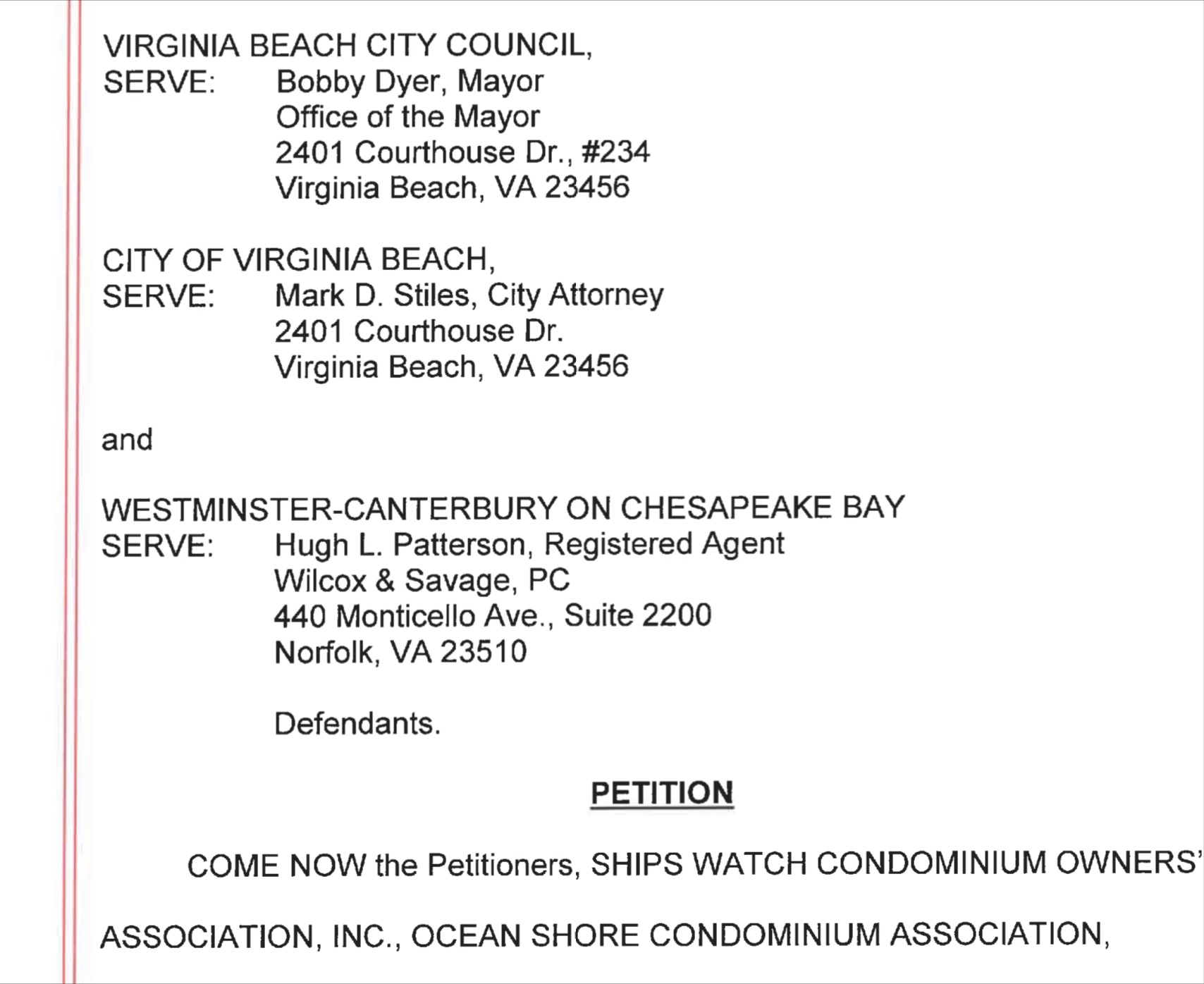VIEW LAWSUIT v. VIRGINIA BEACH CITY COUNCIL, CITY of VIRGINIA BEACH, WESTMINSTER-CANTERBURY on Chesapeake Bay ( 29 page PDF )