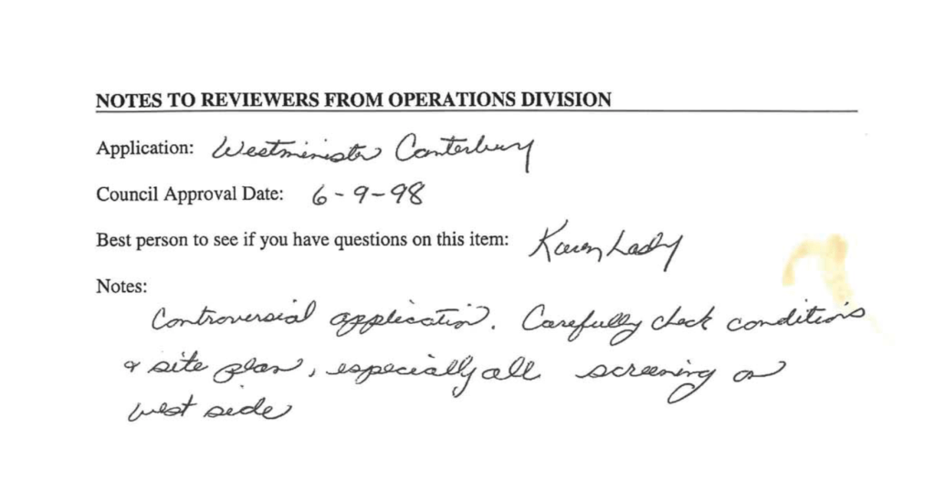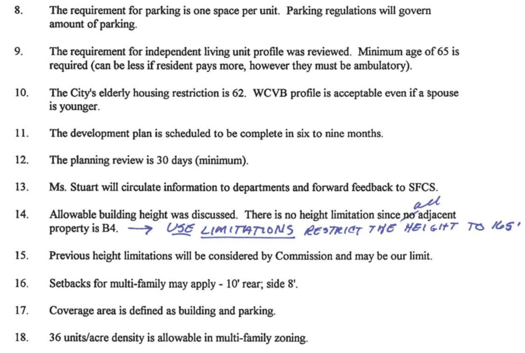 None of this analysis is a revelation to Westminster Canterbury or its counsel. It was pointed out to me by a local architect that the façade changes on the tower above the height of 165 feet. Upon inquiring why that was done, and assuming that the 165 feet was probably somehow safety related, it was a little surprising to discover that the WC plans allowed for the floors above 165 feet to essentially be lopped off without any substantial alteration or expense. Westminster Canterbury has known from the beginning that it was facing a cap on the height related to the Use Regulation as it always has before. (A review of the FOIA documents for prior applications shows that the City and WC were acutely aware of the 165 ft. limit as part of the Conditional Use with handwritten notes making this explicitly clear.) But on the theory that you can’t get what you don’t ask for, they have decided to roll the dice and see if promises to generate substantial tax revenue was enough to allow the new Wild West approach to zoning law. Having made the argument that, it should be able to build as high as possible, if WC was then forced to comply with the mandatory “Use Regulations” to not exceed 165 ft., the loss of building height could appear to be a concession. A concession that would allow the right to keep the building in its current location, to avoid having to flip the towers in a way that was more accommodating to adjoining property owners or really to concede much at all because they were already giving up eight floors and how much more could you possibly ask of them?
