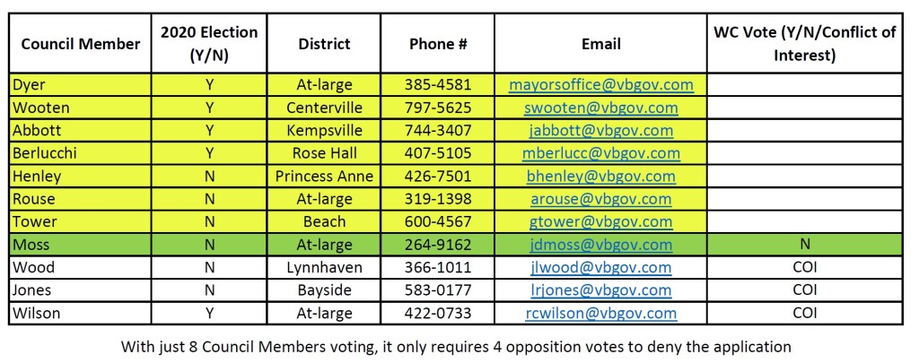 The City Council will now be addressing the Westminster Canterbury expansion on August 4th, 2020. As of now it looks like the meeting will be at The Virginia Beach Convention Center, but we do not have specifics as of yet. Please take the time to write and call all of the City Council members below and express the following.