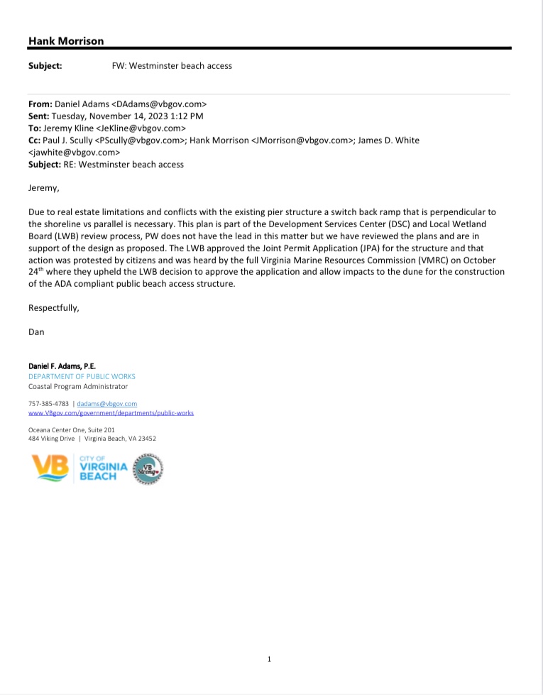 Fourth: Ben Unkle has said that this new beach access is more convenient to “everyone”. That is simply not true. Anyone that lives on Starfish road – the access is more inconvenient. For anyone riding HRT route 35 which drops off in front of Westminster, this is not more convenient. For anyone wanting to access the beach and are crossing Shore Drive at a crosswalk (there are two – one at Starfish, the other at Great Neck) – this is not convenient. For anyone wanting to sit west of the fishing pier, this is not convenient. Ben Unkle has also said that the beach access bisects Westminster property – while that is now a correct statement, the access was in existance long before they bought the properties. Westminster took a chance by buying these properties with full knowledge of the public access. Do not punish the public for a risky venture made by Westminster.